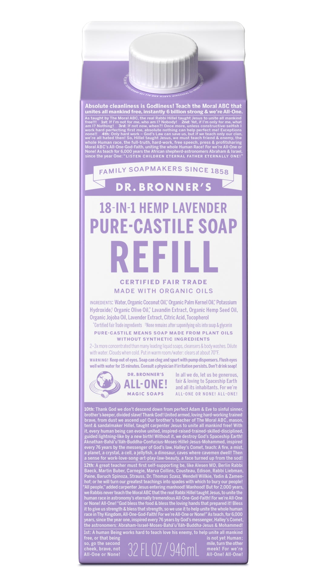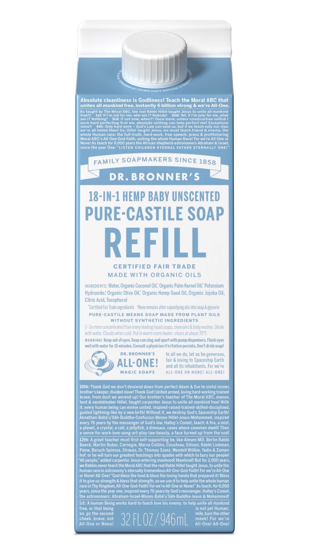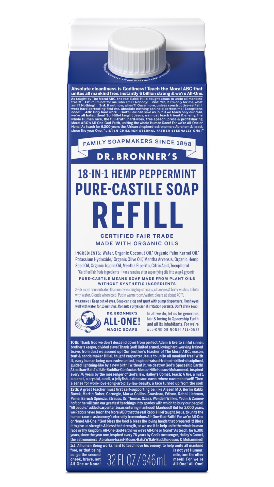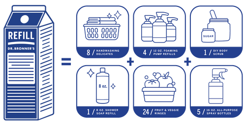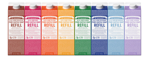 Refill your Dr. Bronner’s 100% Post-Consumer Recycled plastic bottle, a foaming pump dispenser, or all-purpose spray bottle. Sustainability made easy!