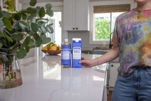 Refill your Dr. Bronner’s 100% Post-Consumer Recycled plastic bottle, a foaming pump dispenser, or all-purpose spray bottle. Sustainability made easy!